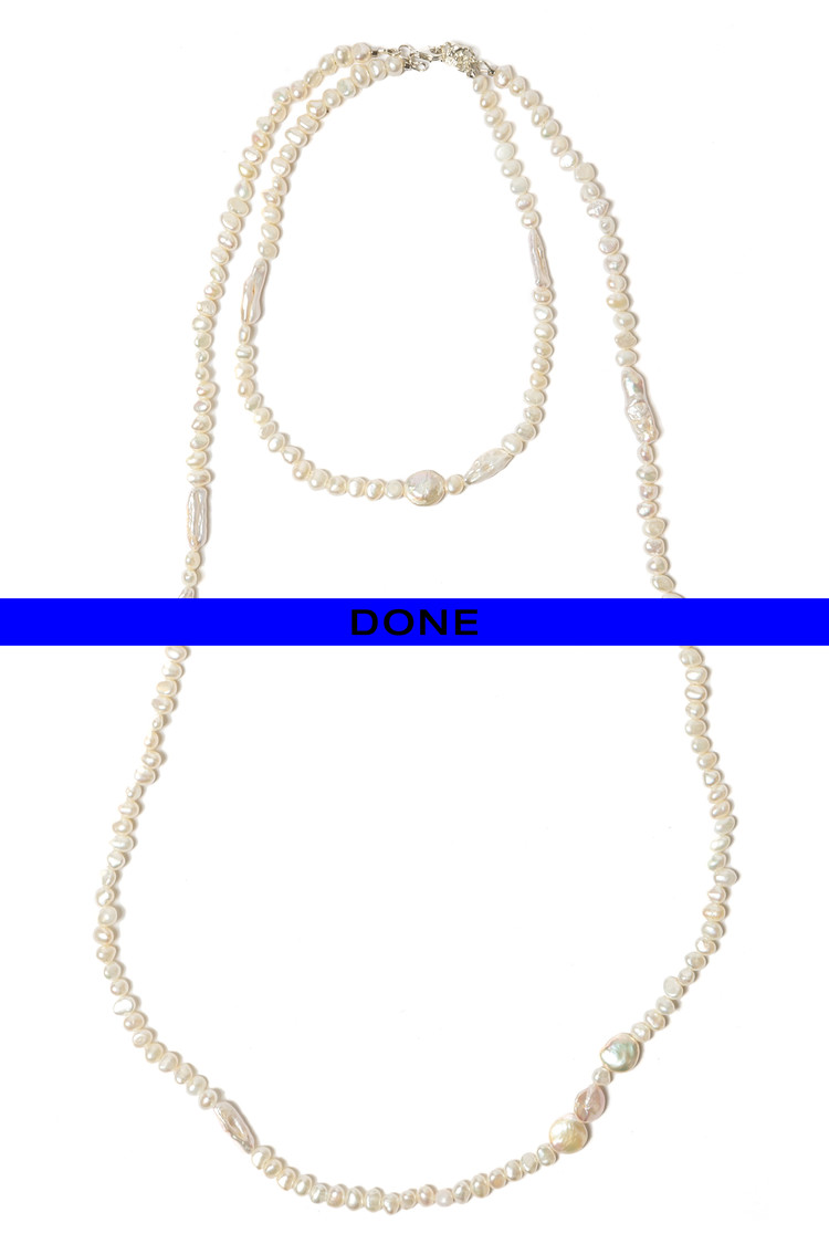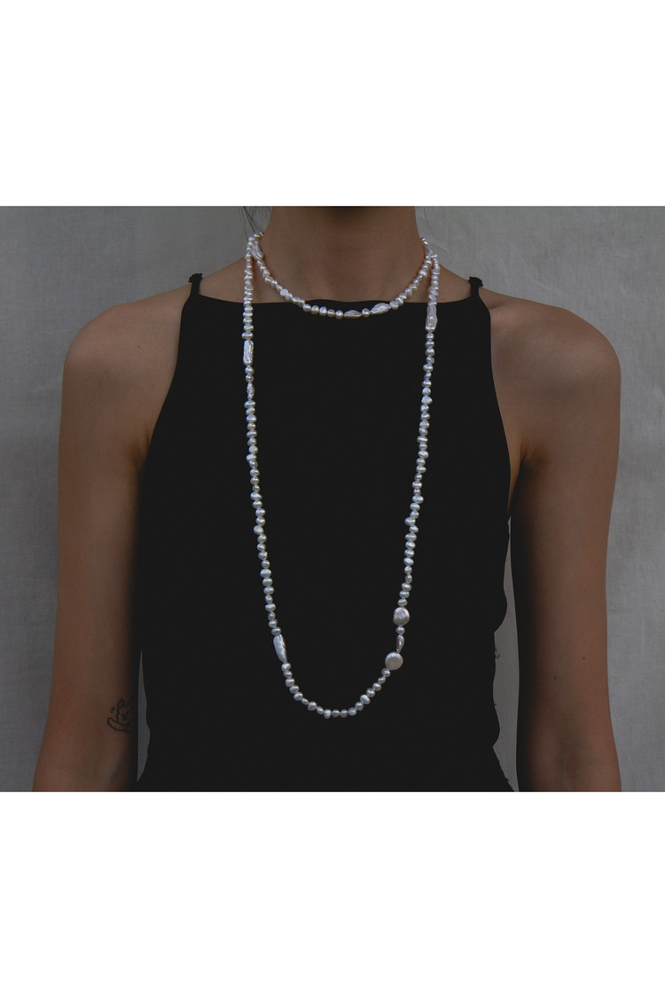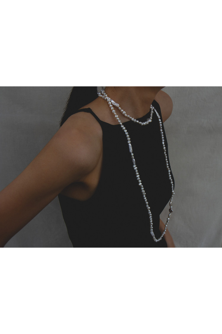 • 다양한 모양의 진주들이 불규칙한 배열 되어 생동감을 주며, 목걸이 길이의 차이를 크게 주어 독특함이 느껴지는 더블 라인 넥클리스